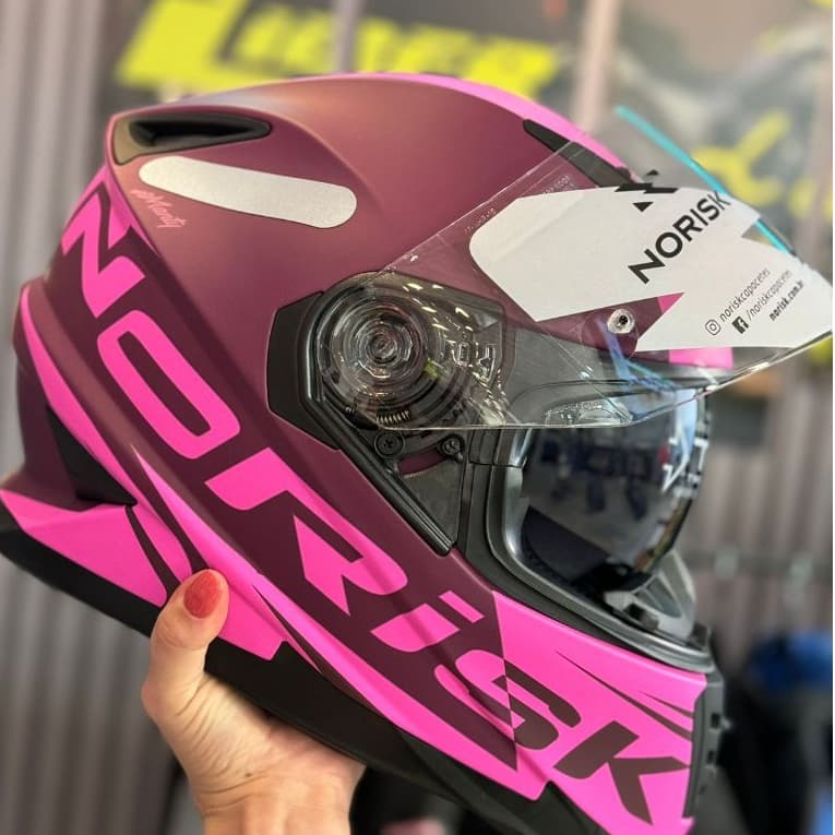 Capacete Norisk. Características: Aqui na NORISK, não seguimos o óbvio, criamos nosso próprio caminho. Então, quando dizemos que somos "descolados", é um compromisso com a mudança e a evolução constante. Estamos aqui para garantir a segurança dos nossos #noriskers. Bora fazer barulho no mundo motociclista #wemakenoise. Há muitos novos caminhos para percorrer com a sua moto e, naturalmente, você precisa de praticidade em suas aventuras. Por isso, a NORISK desenvolveu o Route, uma nova proposta "Feito para quem passa muito tempo com a moto" – Destaca o conforto e a leveza dos capacetes Norisk, ideais para longas jornadas.